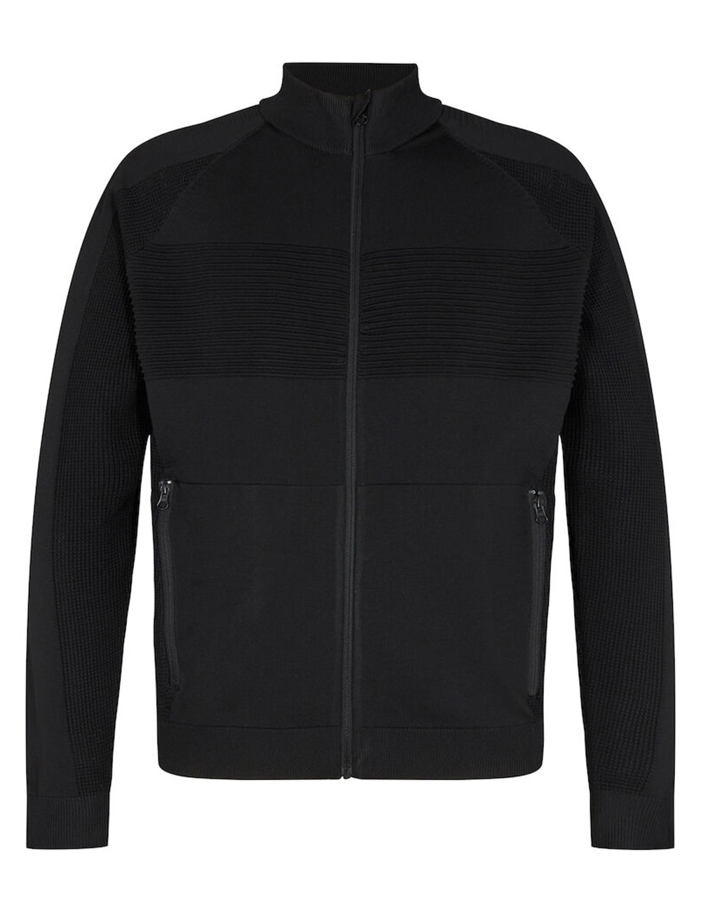 Smart cardigan fremstillet i let og fleksibelt materiale. Højkrave og lynlås i front. Sidelommer med lynlås.