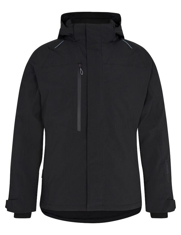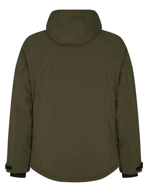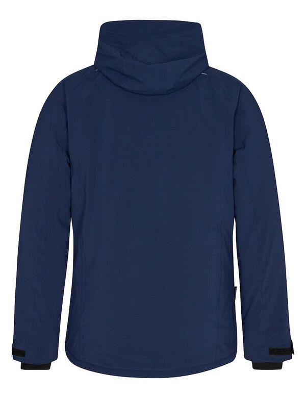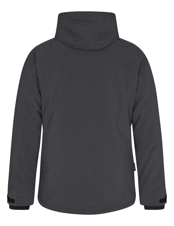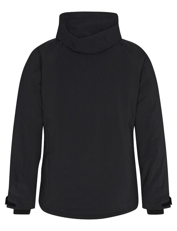 Jakken har aftagelig hætte og ærmer med rib vindfang – begge med reguleringsmuligheder. Forlænget bagstykke og snefang i bunden. Lynlås i for, for anbringelse af tryk. Reflekspipings for øget synlighed.