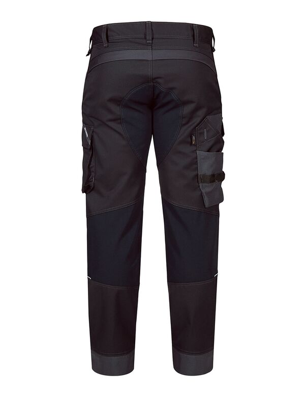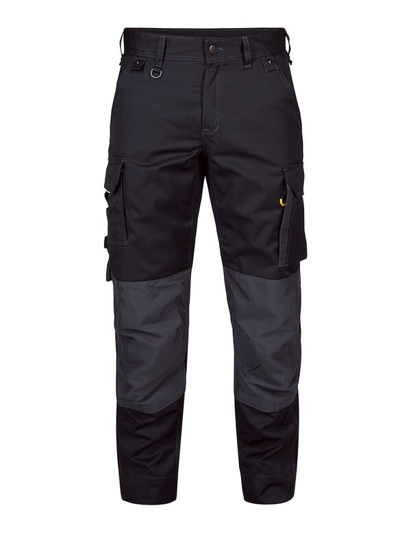 Ergonomisk formet knæparti. Med indsatser af ekstra strækbart og ventilerende materiale i knæhaser og bagpå bliver komforten ekstra høj. D-ring foran til påsætning af f.eks. ID-kort. To rummelige skrålommer foran. To baglommer med klap. Telefonlomme med klap på højre lår.