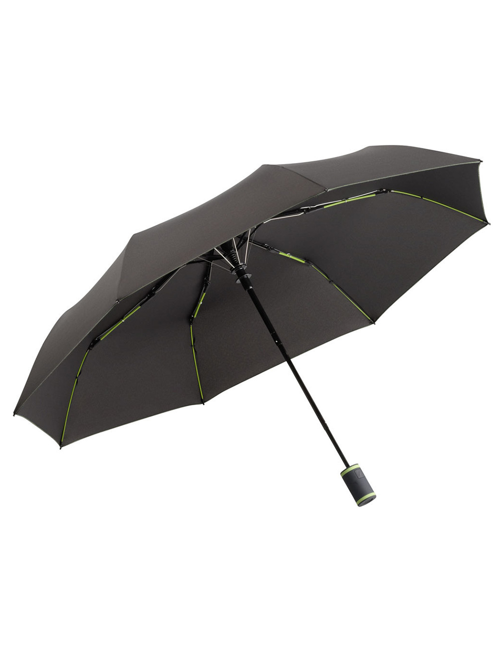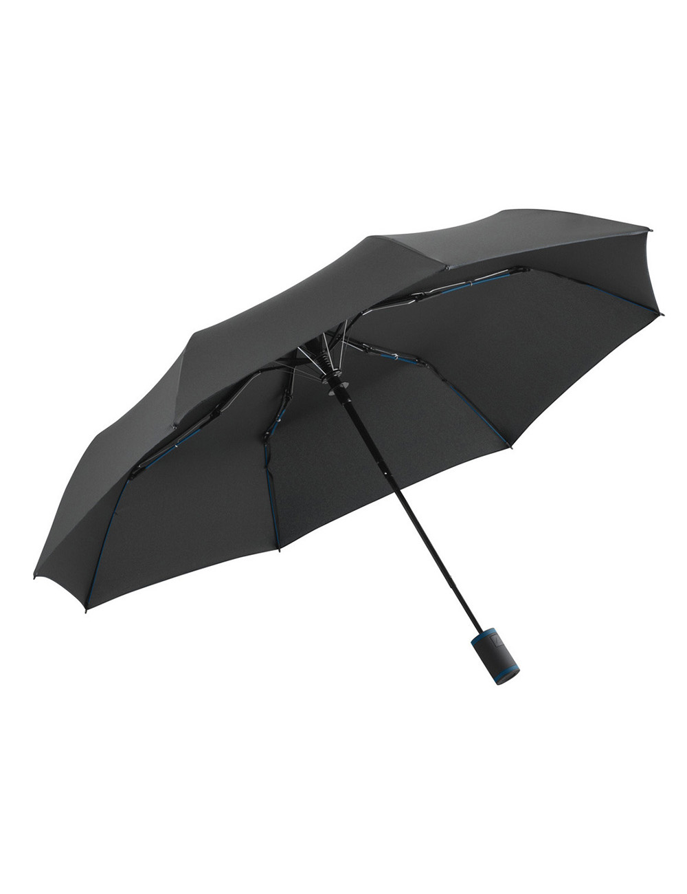 Taskeparaply med automatisk åbning, samt ribber og håndtag med kontrastdetaljer.