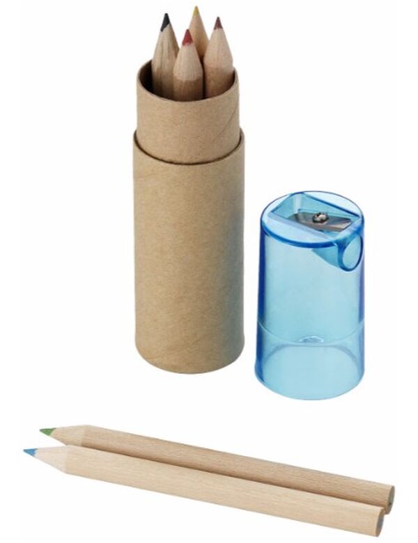 Min. antal: 100Sæt med 6 farveblyanter i cylinderformet papbeholder med blyantspidser i låget.