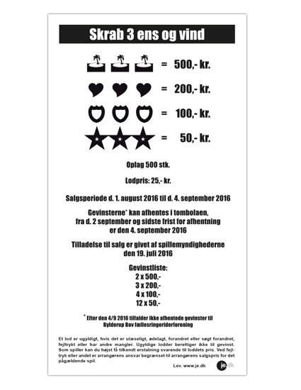 Min. antal: 500Skrabelod med ét skrabefelt, hvor der skal være 3 ens symboler under skrabefeltet for gevinst.