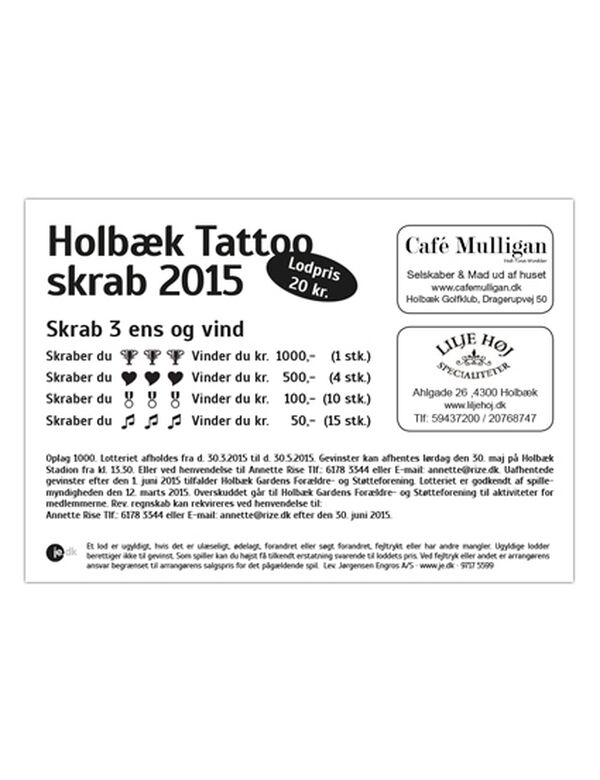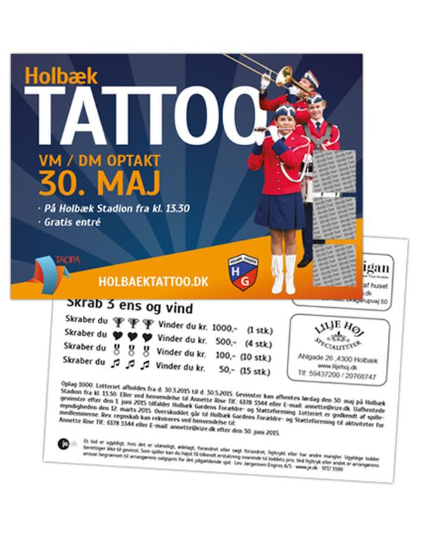 Min. antal: 500Skrabelod med 3 skrabefelter, hvor der skal skrabes 3 ens symboler for gevinst.