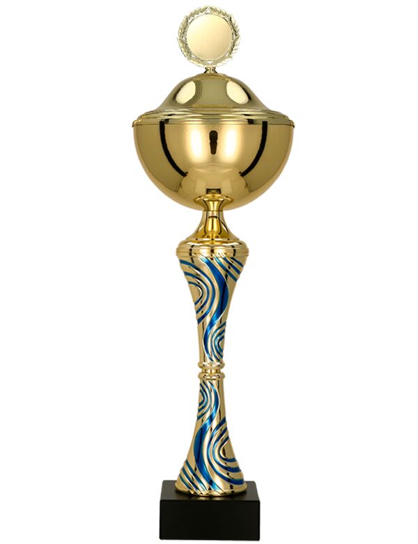 Min. antal: 1Flot guldpokal med blå detaljer og låg.