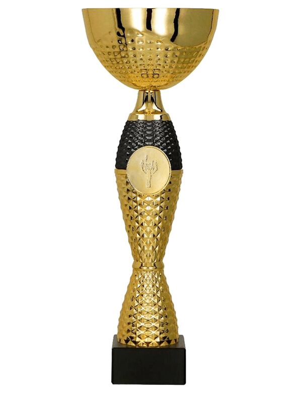 Flot guldpokal med sorte detaljer og låg.