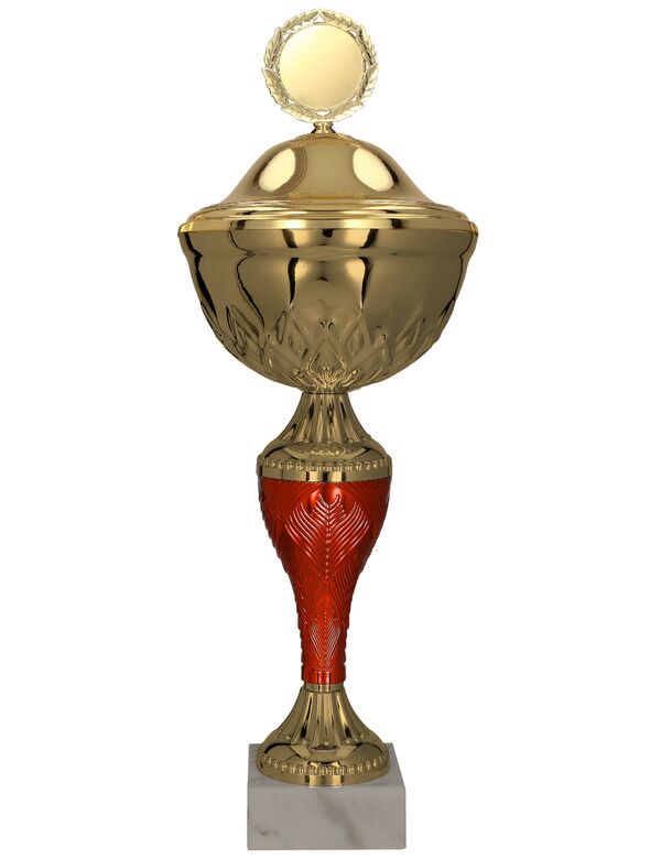 Min. antal: 1Flot guldpokal med røde detaljer og låg.