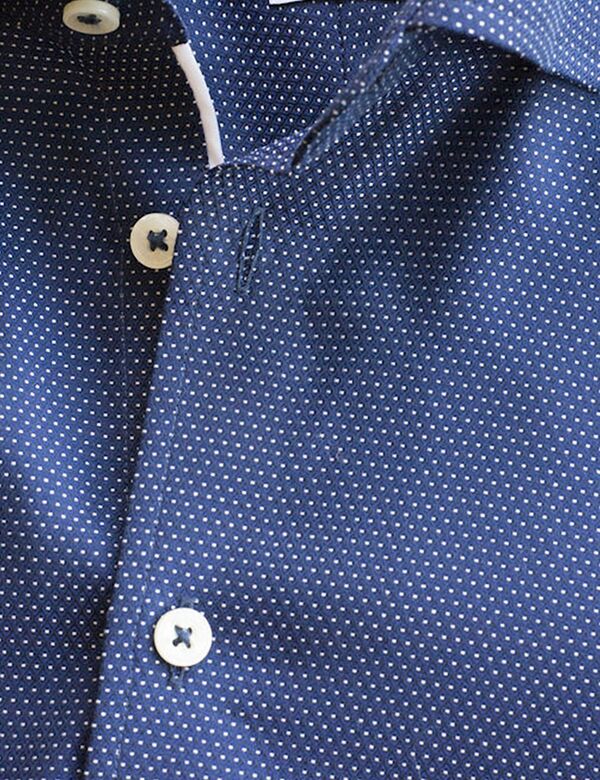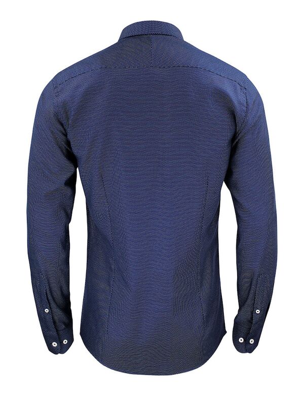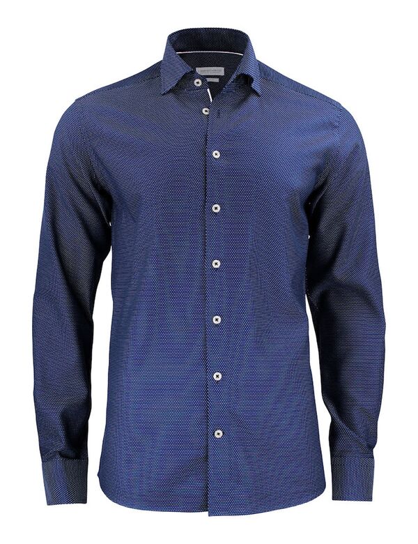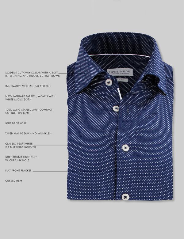 Skjorten er lavet i dobbelt 100 jacquard kvalitet, med fint mikro mønster med hvide prikker. Kombiner den med jakkesættet eller mere afslappet med et par jeans.