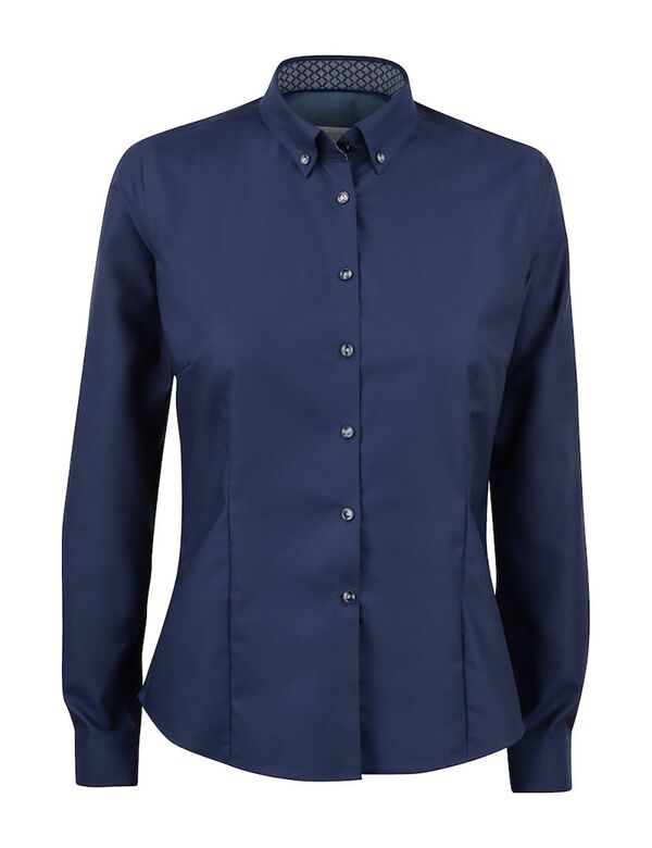Skjorten er med stilsikre detaljer, som skjult brystlomme og matchende kontrast farver de helt rigtige steder.