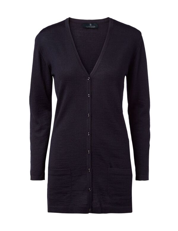 Min. antal: 10Lang damecardigan med v-hals og lommer.