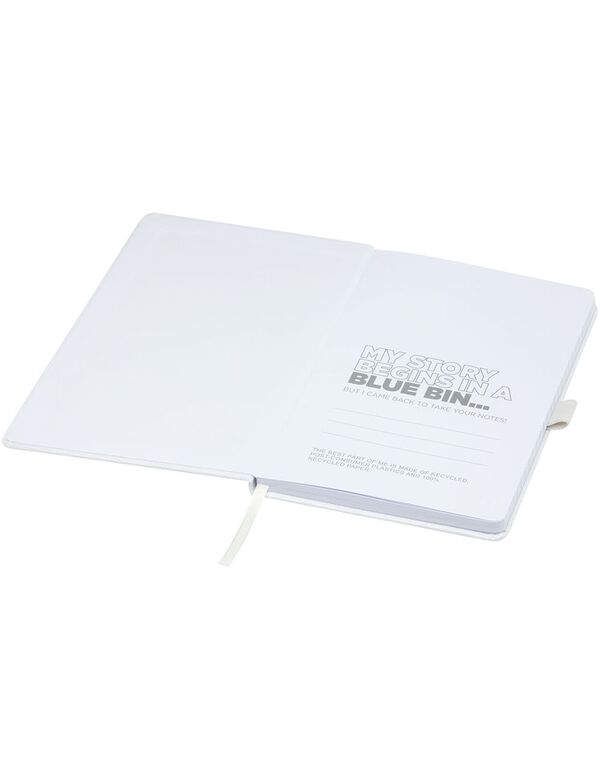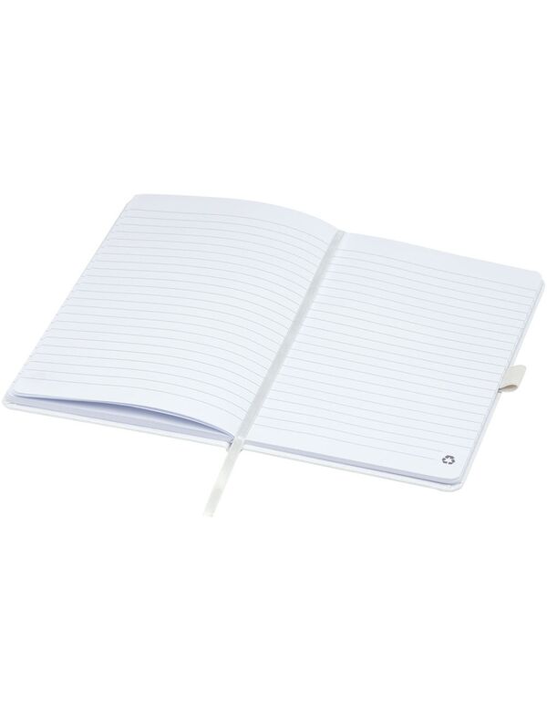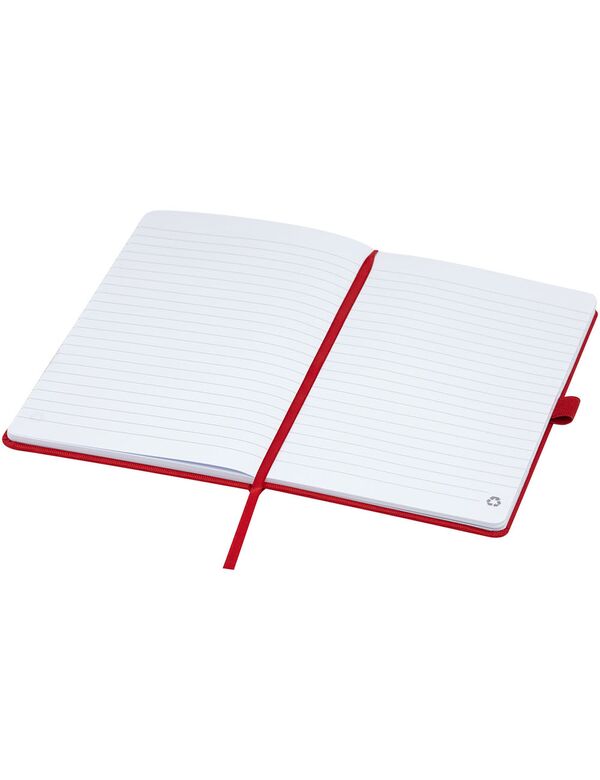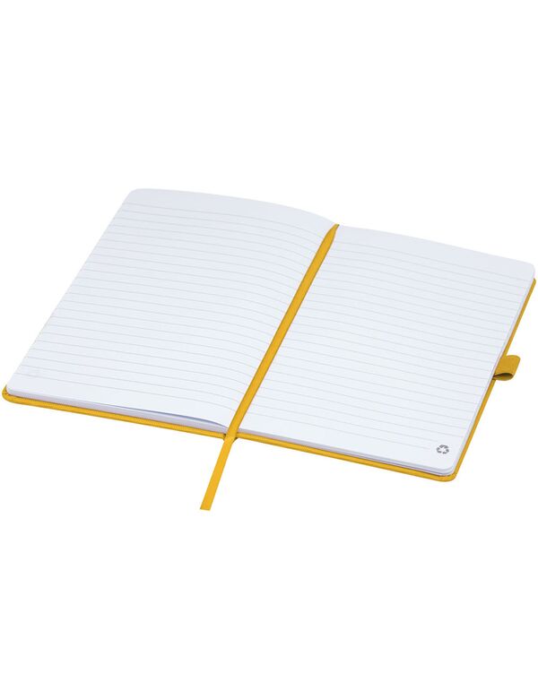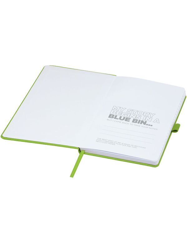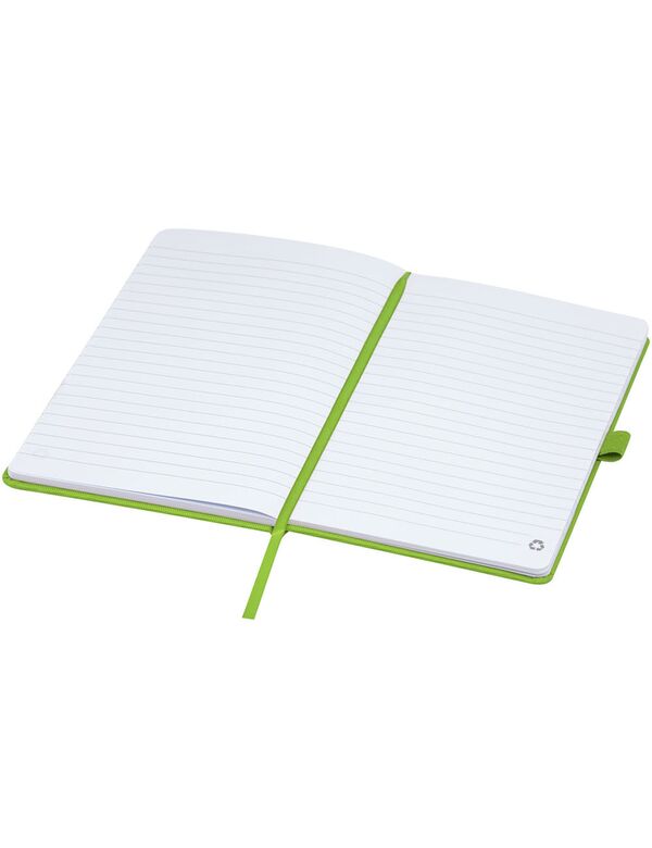 Indeholder 80 ark 70 g/m2 genbrugspapir med linjeret layout, blyantsholder og bogmærke.