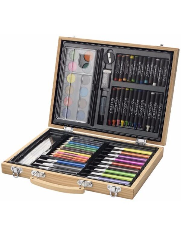 Min. antal: 50Sæt med 12 vandfarver, 12 farveblyanter, 12 tusser, 12 oliefarver, 12 farvekridt, paletter, lim, viskelæder, blyantspidser, HB-blyant og pensel, alt sammen i trækuffert.