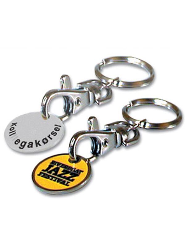 Specialfremstillet nøglevedhæng med mønt til indkøbsvogn.