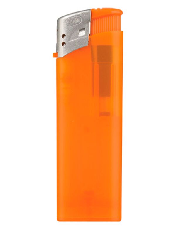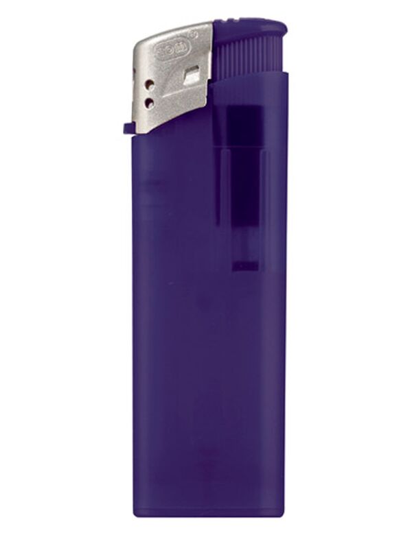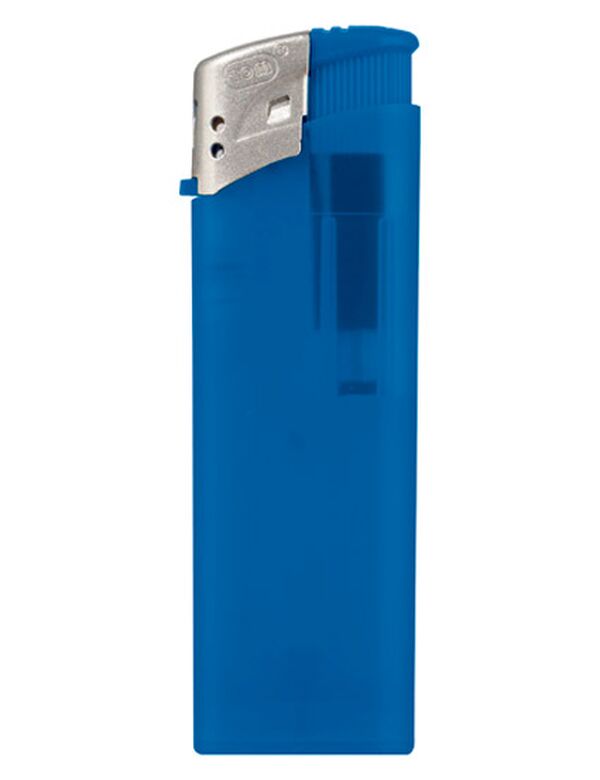 Elektronisk lighter i frostet plast og med sølvfarvet hætte.