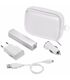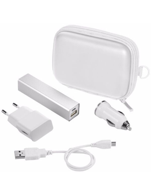 Sættet indeholder en 2200 mAh Volt powerbank, en 5V/1A biladapter, en 5V/1A AC-adapter, som kan bruges i de fleste europæiske lande, og et micro USB/USB-ladekabel.