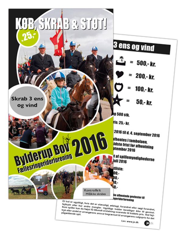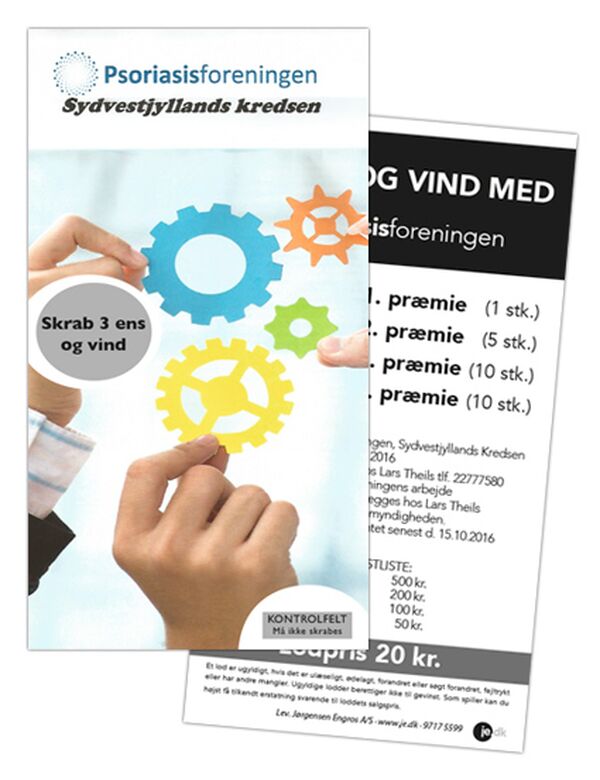 Min. antal: 500Skrabelod med ét skrabefelt, hvor der skal være 3 ens symboler under skrabefeltet for gevinst.